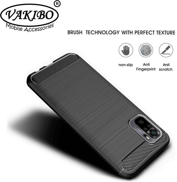 VAKIBO Carbon Fiber Brushed Black Coloured Soft TPU Back Cover Case With Camera Protection Ring Suitable for MI Redmi Note 10